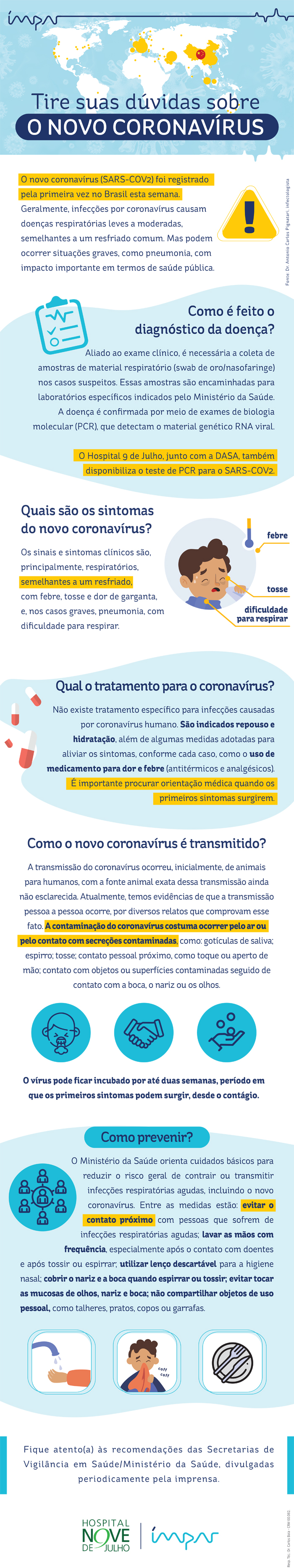 O novo coronavírus (covid-19) foi registrado pela primeira vez no Brasil esta semana. O paciente tem 61 anos e vinha da Itália para a cidade de São Paulo. Diante deste alarde, a equipe da Infectologia da Rede Ímpar, da qual o Hospital 9 Julho faz parte, preparou um infográfico para esclarecer sobre a doença, sintomas, formas de tratamento e transmissão.